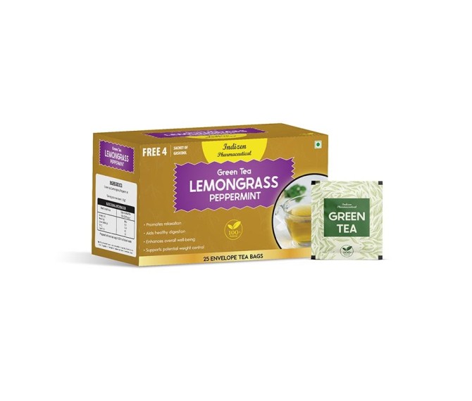 Composition : Green Tea + Lemongrass + Peppermint Packing : 25 BAGS Type : 25*1.3G Detail:-Experience a refreshing blend of green tea and lemongrass — rich in antioxidants, supports digestion, boosts immunity and detox.