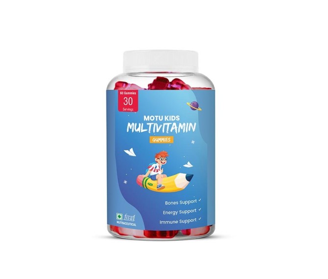 Composition : Vitamin A 250 Mcg + Vitamin B3 7 Mg + Vitamin B6 0.6 Mg + Vitamin B12 0.4 Mcg + Vitamin C 18 Mg + Vitamin D3 3.75 Mcg + Folic Acid 75 Mcg+ Vitamin E 4 Mg + Biotin 10 Mcg + Calcium Pantothenate 1 Mg + Iodine 15 Mcg + Inositol 16 Mcg Packing : 60 Gummies Type : Bottle Pack Detail:-MOTU Kids Multivitamin Gummies — tasty, chewable daily multivitamins designed to support growth, immunity and overall health in children.