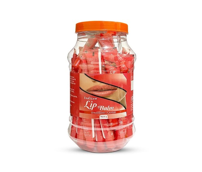 Composition : Lip Balm In Strawberry Flavour Packing : 10gm Type : 70 Pec Zar Pack Detail:-Nourish and protect your lips with Indizen Lip Balm — a gentle, moisturizing balm designed to soothe dryness, prevent chapping, and keep lips smooth & soft all day. Try Indizen Lip Balm for healthy, hydrated lips.