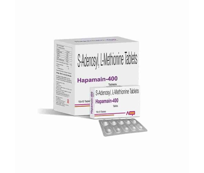 Composition : S-adenosyl Methionine Methionine 400 Mg Packing : 10*10 Type : Alu Alu Detail:-HAPAMAIN 400 mg Tablet with S‑Adenosyl Methionine (SAMe) for mood support and liver health. Quality pharmaceutical product by Asto Care Pharma