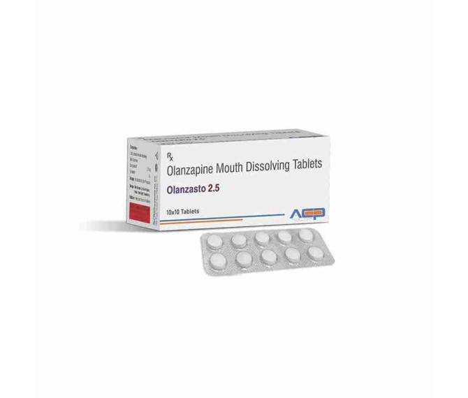 Composition : Olanzapine 2.5 Mg Mouth Dissoliving Tab. Packing : 10*10 Type : Blister Detail:-Olanzasto‑2.5 Tablet contains Olanzapine 2.5 mg, an atypical antipsychotic used for schizophrenia and bipolar disorder management.