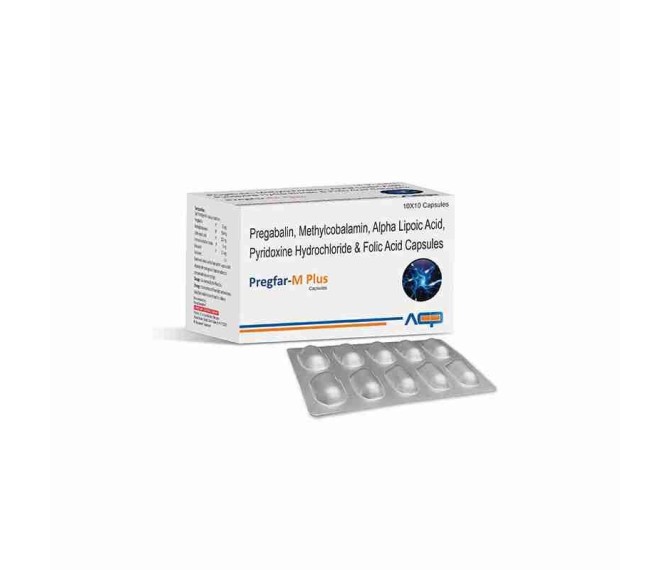 Composition : Pregabalin 75 Mg + Mecobalamin 750 Mcg + Alpha Lipoic Acid 100 Mg + Folic Acid 1.5 Mg + Pyridoxine 3 Mg Packing : 10*1*10 Type :  Alu Alu Detail:-Pregfar M Plus Capsule with Pregabalin 75 mg, Mecobalamin 750 mcg, Alpha Lipoic Acid, Folic Acid & Pyridoxine for neuropathic pain relief and nerve support.