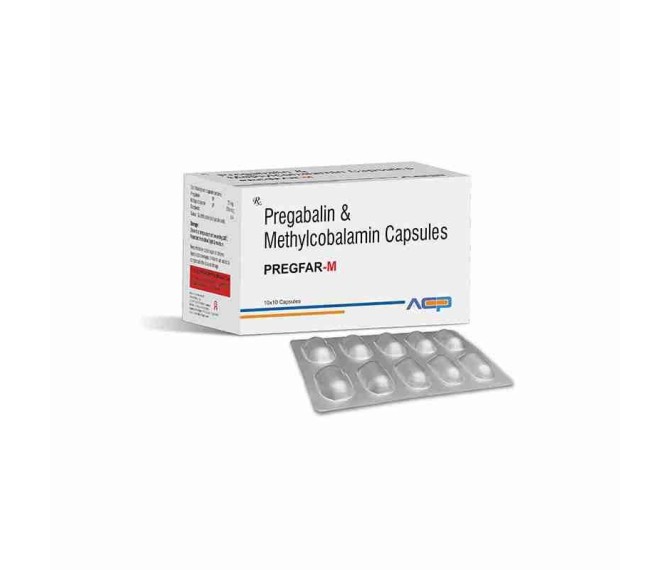 Composition : Pregabalin 75 Mg + Methylcobalamin 750 Mcg Packing : 10*10 Type : Alu Alu Detail:-Pregfar M Tablet contains Pregabalin 75 mg and Methylcobalamin 750 mcg for neuropathic pain relief and nerve health support.