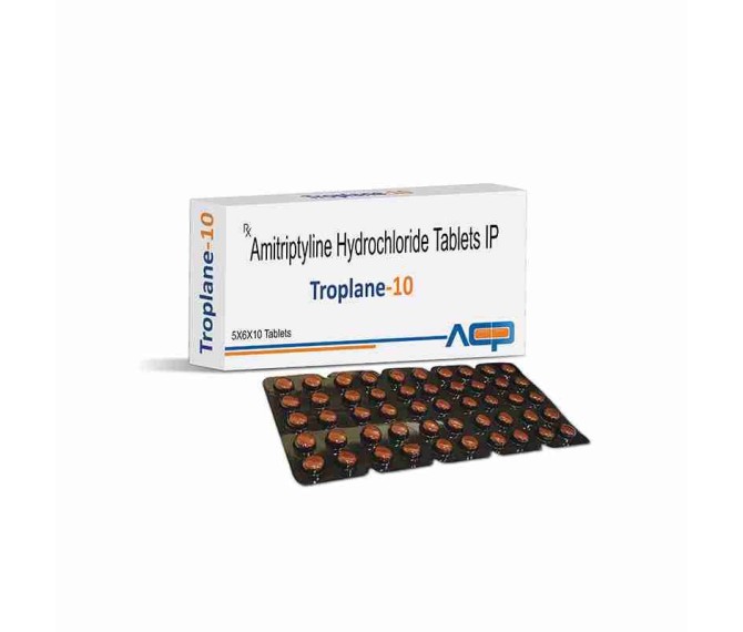 Composition : Amitriptyline Hcl 10 Mg Packing : 30*10 Type : Blister Detail:-Troplane 10 Tablet with Amitriptyline 10 mg for depression, anxiety, and nerve pain. Quality product by Asto Care Pharma.