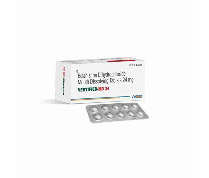 Composition : Betahistine 24 Mg Mouth Dissolving Tablet Packing : 10*10 Type : Alu Alu Detail:-Vertified‑MD 24 Tablet with Betahistine 24 mg for vertigo, dizziness and Ménière’s disease symptom relief.