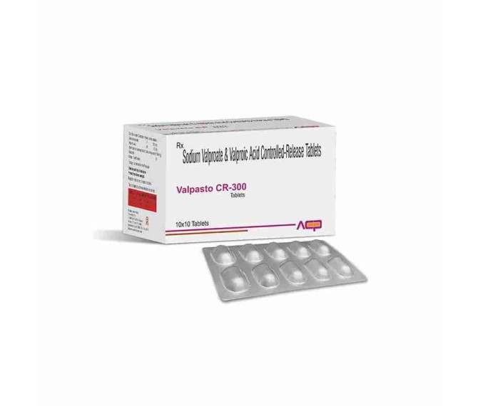 Composition : Sodium Valporate + Valporic Acid ( 300 Mg ) Controlled Release Packing : 10*10 Type :  Alu Alu Detail:-Valpasto CR 300 Tablet with Sodium Valproate & Valproic Acid for epilepsy, seizure control, bipolar disorder and migraine prevention