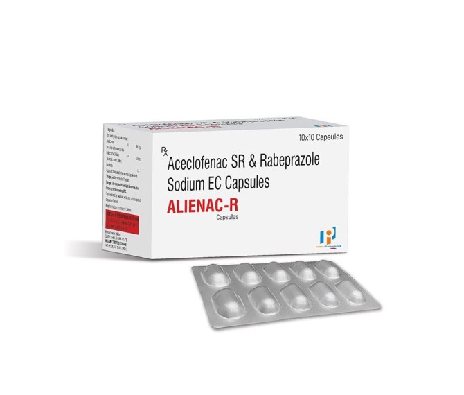 Composition : Aceclofenac 200 Mg + Rabeprazole 20 Mg Packing : 10*10 Type : Alu Alu Detail:-ALIENAC R by Indizen Pharma provides effective relief from pain and inflammation. Formulated for fast action to ease joint, muscle, and back pain efficiently.