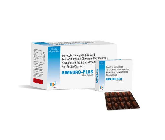 Product Name:-RIMEURO PLUS Composition:- METHYLCOBALAMIN 1500 MCG + ALA 200 MG + FOLIC ACID 1.5 MG + ZINC 25 MG +CHROMIUM PICOLINATE 200 MCG + SELENOMETHIONINE 55 MCG + INOSITOL 100 MG Packing:-10*1*15 Type:-BLISTER Detail:-RIMEURO PLUS tablets are prescribed to support relief from neuropathic pain and nerve-related discomfort.