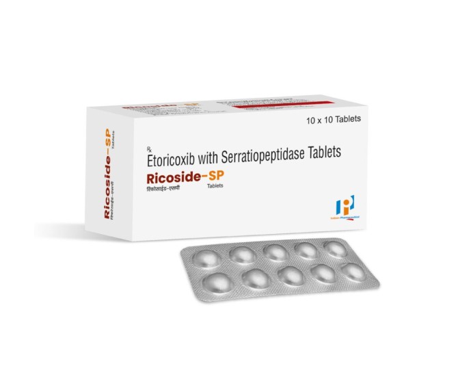 Product Name:-RICOSIDE SP Composition:- ETORICOXIB 60 MG + SERRATIOPEPTIDASE 10 MG Packing:-10*10 Type:-ALU ALU Detail:-RICOSIDE SP tablets are prescribed to help manage pain, inflammation, and associated discomfort.