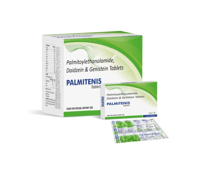 Product Name:-PALMITENIS 354 Composition:- PALMITOYLETHANOLAMIDE 300 MG + DAIDZEIN 50 MG + GENISTEIN 4 MG Packing:-10*1*15 Type:-ALUMUNIUM STRIP Detail:-PALMITENIS 354 contains Palmitoylethanolamide 354 mg, supporting relief from nerve pain and inflammation.