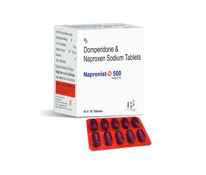 Composition : Naproxen 500 Mg + Domperidone 10 Mg Packing : 1 10*10 Type : Blister Detail:-Napronist-D 500 by Indizen Pharma relieves pain, inflammation, and nausea linked to migraine or arthritis.