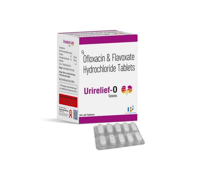 Composition : Ofloxacin 200 + Flavoxate 200 Mg Packing : 10*10 Type : Blister Detail:-Urirelief‑O combines Ofloxacin 200 mg and Flavoxate 200 mg for urinary relief. Quality product by Indizen Pharma.