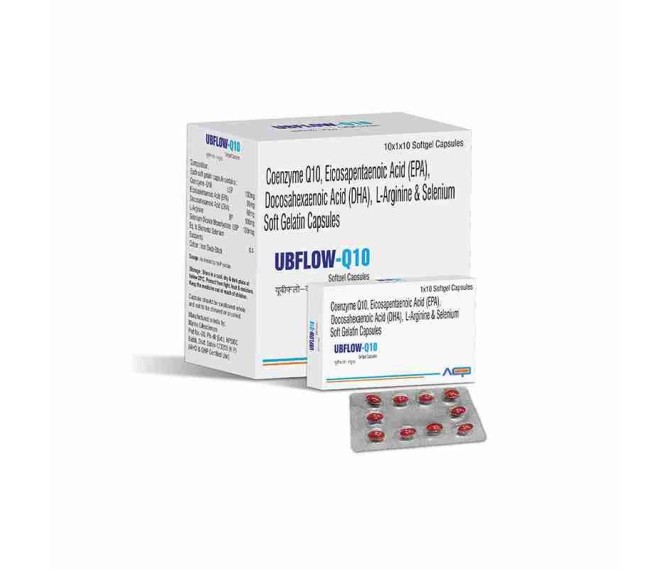 Composition : Co-enzyme-q10 100 Mg + Epa 90 Mg + Dha 60 Mg + L-arginine 100 Mg + Elemental Selenium 100 Mcg In Drug Sg Cap Packing : 10*1*10 Type : Blister Detail:-Ubiflow Q10 by Asto Care Pharma contains Co‑enzyme Q10, EPA, DHA, L‑arginine and selenium — a comprehensive formula for antioxidant support and overall health.