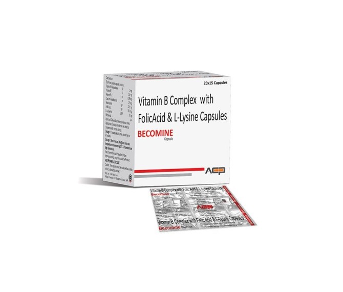 Composition : Vitamin B1 2 Mg + Vitamin B2 2.5 Mg + Vitamin B6 0.75 Mg + Calcium Panthothenate 2.5 Mg + Niacinamide 22.5 Mg + Folic Acid 300 Mcg + L-lysine Hcl 50 Mg Packing : 20*15 Type : Strip Packing Detail:-Becomine is a comprehensive vitamin B complex supplement enriched with essential amino acids to support energy production, nerve health, and overall vitality.
