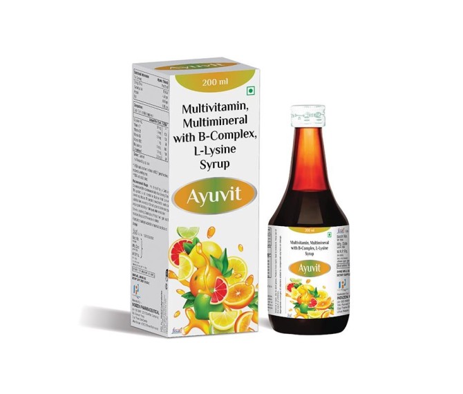 Composition : B-complex & Multivitamins + L-lysine Syrup in Drug Formulation Packing : 60*1 Type : Mono Pack 200 ml Detail:-Ayuvit by Indizen Pharma – a comprehensive B-complex, multivitamin & L-lysine syrup formulated to support overall nutrition, immunity and vitality. Premium quality health supplement.