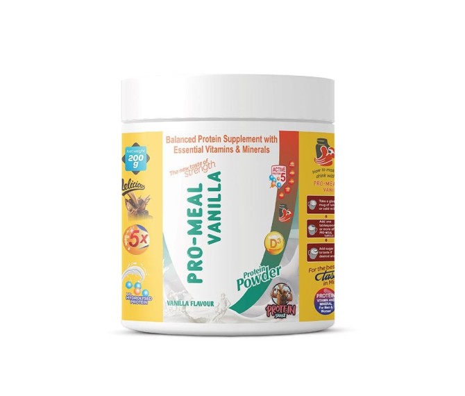 Composition : Protein Powder With Multivitamin & Multiminerals In Drug Packing : 200 Gm. Type : Pet Jar Detail:-Pro Meal Vanilla by Indizen Pharma – a 200 g vanilla‑flavored nutritional protein powder enriched with multivitamins and multiminerals to support balanced nutrition, energy and overall wellness.