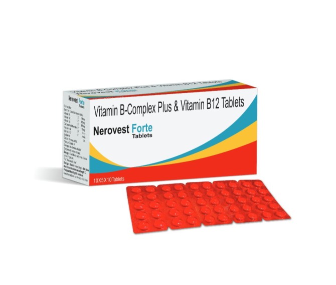 Composition : Thiamine Mononitrate (Vitamin B1 ) 1 Mg + Riboflavine 0.5 Mg + Pyridoxine B6 0.5 Mg + Calcium Pantothenate 1 Mg + Niacinamide 10 Mg + Cyanocobalamine ( Vitamin B12 ) 5 Mcg Packing : 50*10 Type : Alu Alu Detail:-Nerovest Forte by Indizen Pharma – vitamin B‑complex with B1, B2, B6, B12 and niacinamide tablets to support nerve health, energy metabolism and overall wellness. Premium nutritional supplement.