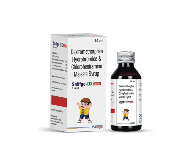 Composition : Dextromethorphan 5 Mg + Chlorpheniramine 2 Mg Packing : 60 Ml Type : Mono Detail:-SNIFFGO-DX JUNIOR Syrup with Chlorpheniramine and Dextromethorphan provides effective relief from dry cough, cold, and allergy symptoms in children. Trusted pediatric formulation by Asto Care Pharma.