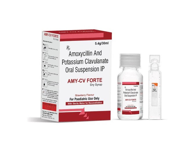 Composition : Amoxycillin 400 Mg + Clavulanate 57 Mg Ds ( Glass Bottle ) Packing : 30 ML Type : Mono Pack + sterile water Detail:-AMY-CV Forte helps manage moderate to severe bacterial infections with trusted antibiotic combination therapy.