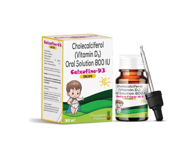 Composition : Cholecalciferol 800 Iu Drops ( In Drug ) With Glass Bottle Packing : 30 ML Type : Mono Pack Detail:-Calxofine D3 800 IU combines calcium with vitamin D3 to support strong bones, teeth, and muscle function.