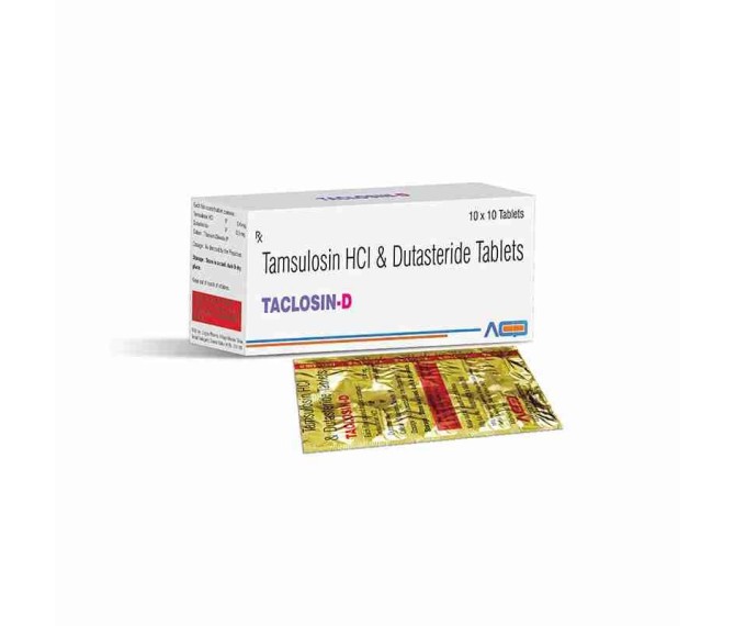 Composition : Tamslosin 0.4 + Dutasteride 0.5 Mg Packing : 10*10 Type : Strip Packing Detail:-Taclosin‑D combines tacrolimus with supportive agents for enhanced immunosuppressive therapy. Quality ensured by Asto Care Pharma.