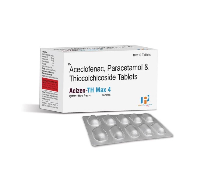 Composition : Aceclofenac 100 Mg + Thiocolchicoside 4 Mg + Paracetamol 325 Mg Packing : 10*10 Type : Alu Alu Detail:-ACIZEN‑TH MAX 4 combines Aceclofenac 100 mg, Thiocolchicoside 4 mg, and Paracetamol 325 mg to relieve pain, inflammation, and muscle spasms, providing fast and effective relief for musculoskeletal and joint discomfort.